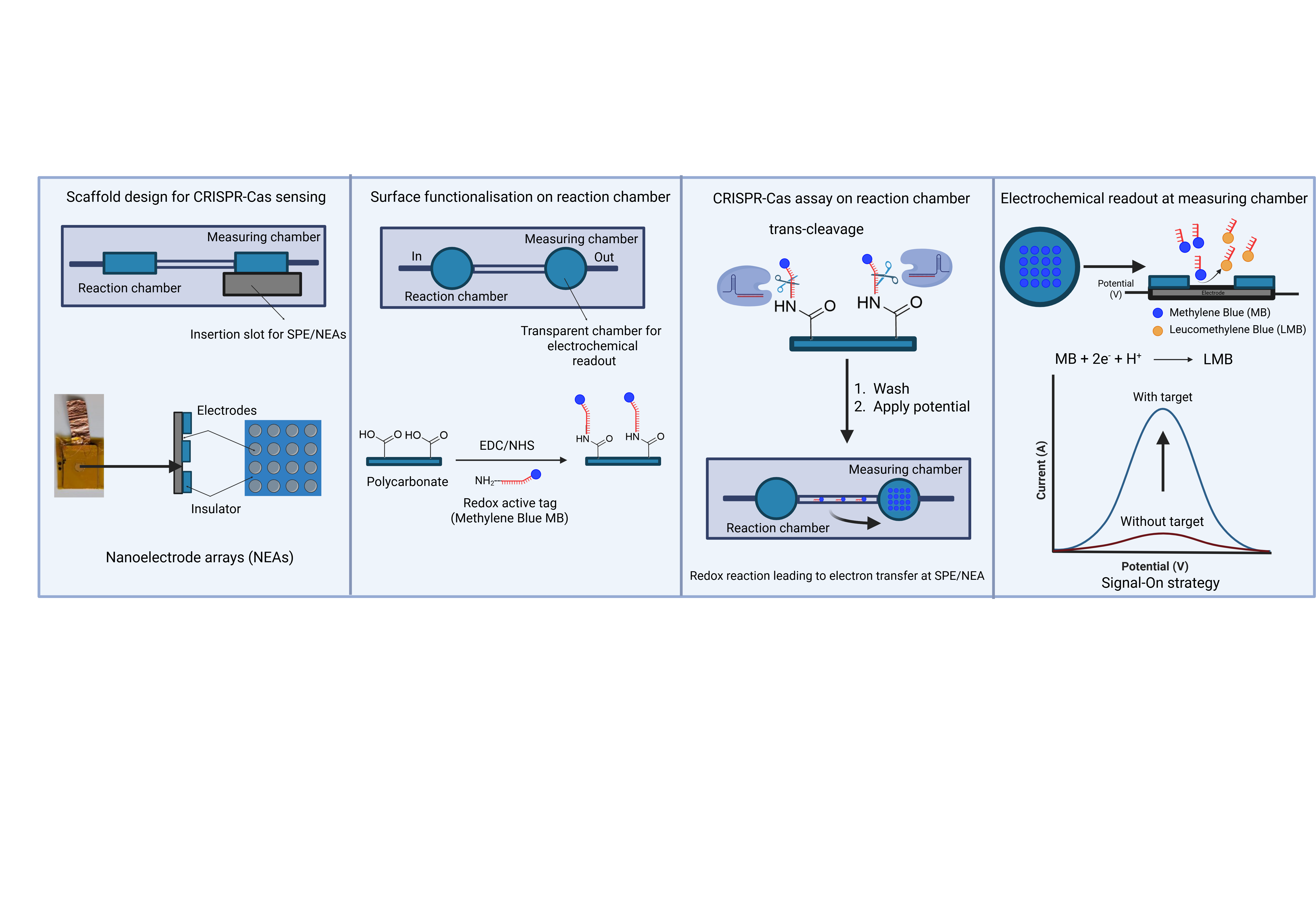 The applicability of CRISPR-Cas has gone beyond genome editing and has found expansive use in molecular diagnostics. While there have been many fluorescent sensors, electrochemical sensors for CRISPR-Cas are now rapidly gaining attention as they reduce the need for expensive instruments, are low-cost, and can be used in low-resource settings, satisfying the requirements for an ideal point-of-care testing (POCT) device [1].