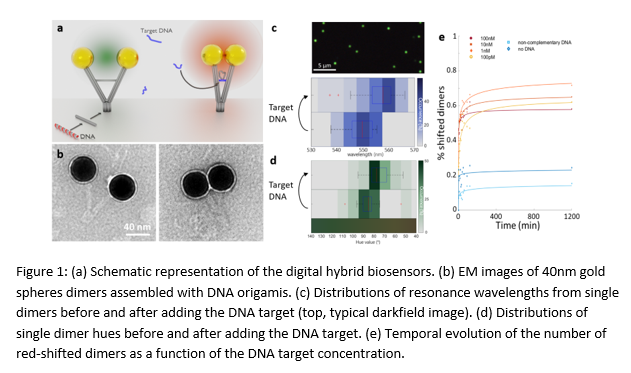 The scaffold of our DNA origami features an active site with a conformation that can be tuned by hybridizing specific DNA single strands (Fig. 1-b). One-step digital colorimetric sensing of DNA single strands is achieved using a strand displacement reaction. These measurements are carried out both by performing single-nanostructure scattering spectroscopy (Fig.1-c) and by analyzing the hue of single dimers in dark-field images (Fig.1-d), obtaining similar statistical responses. The kinetics of these single DNA sensing events are monitored as a function of the concentration of the target strands (Fig. 1-e) and by introducing one or two base mismatches in the DNA sequence to characterize the sensitivity and specificity of these hybrid nanosensors. These results highlight the versatility of DNA origamis for colorimetric sensing, in particular to monitor single DNA or RNA strands on a simple color camera.