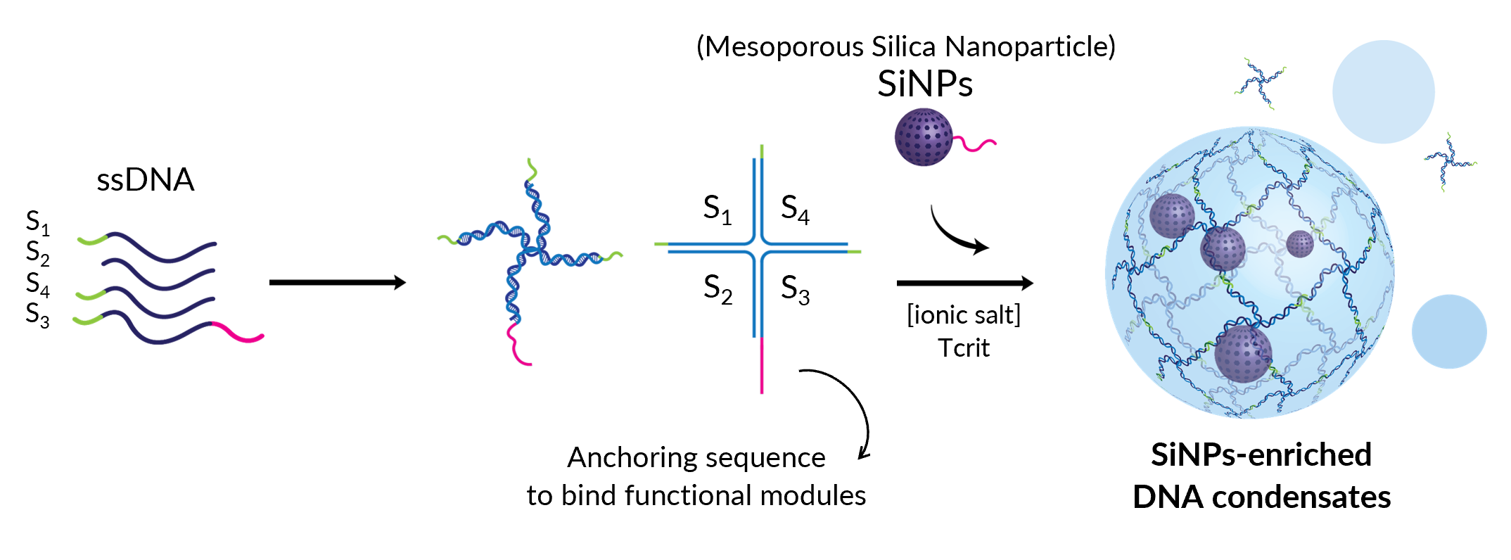 Biomolecular condensates ̶ dynamic, biomolecule-enriched droplets which arise owing to Liquid-Liquid Phase Separation (LLPS) ̶ have been recently described to be implicated in many key vital processes within cells [1,2]. Although intracellular LLPS is extremely complex, the use of nucleic acids’ high programmability, governed by Watson-Crick-Franklin base-pairing, offers a straightforward mechanism to form predictable artificial condensates [2]. Specifically, DNA nanotechnology provides a powerful platform for the engineering of condensates with tuneable structures and functions by capitalizing on the vast toolbox available to the field [3]. Consequently, recent studies have demonstrated the formation of DNA condensates capable of selective-partitioning target molecules of interest, spatiotemporally controlled biochemical reactions and stimuli-responsive phase-separation and partitioning behaviours [4,5,6,7].